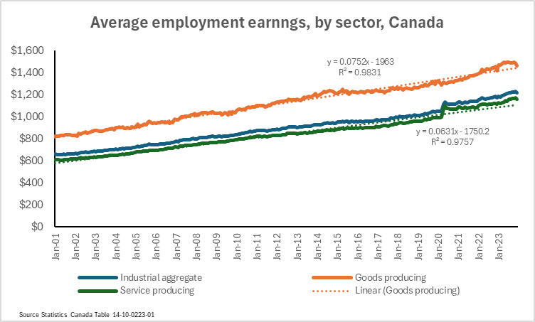 The Figure below summaries the principle findings of the data. Over the last quarter century average employment earnings have risen consistently, goods-producing industries pay in the order of a quarter above the service producing industries although the service sector employees received and retained a bump-up in their weekly earnings since the advent of the covid-19 pandemic. Simple linear regressions are very significant for both sectors with R-squared values in the very high 90s. It is interesting that service-producing sector earnings have remained above their trend lines since 2020 while goods-producing sector has fluctuated around their trend line.