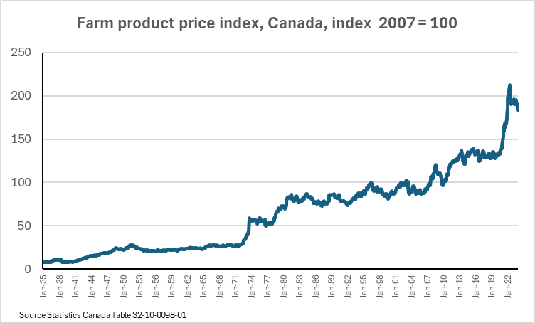 Statistics Canada has tracked the farm prices since at least 1935, publishing the Farm Product Price Index. The basket of farm products included in the index has been updated through the years to include livestock products in 1992.