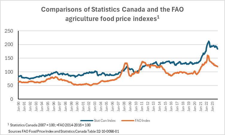 The United Nations Food and Agriculture Organization (FAO) also monitors global farm prices and publishes a global price index. The FAO food index starts in 1990 and confirms the direction of the the price movements as documented by Statistics Canada for Canadians.