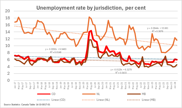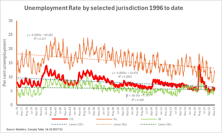 The unemployment rate for Canada, Saskatchewan and Newfoundland & Labrador since 1996 illustrated below. This period had a number of economic shocks that disrupted the economy, starting with the dot-com melt down in the late 90s, the 9-11 terrorist attack, the global financial crisis and the covid pandemic. Given these global shocks unemployment rates were fairly stable.