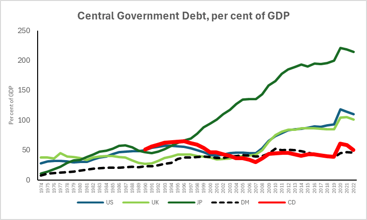 This post only presents the relative debt to GDP ratios for selected countries. The central message of this post is moving forward for an individual country, its debt to GDP gets larger if the real interest rate on its debt is higher than its real GDP growth. That is simple arithmetic. It is also assumed that the existing debt to GDP ratio is a consequence of each country’s socio-economic values, for example some countries have a larger public sector (think health care, education and defense) and willingly service the costs through the government taxes and sometimes borrowing. Other countries want smaller public sectors, leaving as many functions in private hands. It is their choice. Moving forward, building on decisions reflecting their values, is the primary concern.