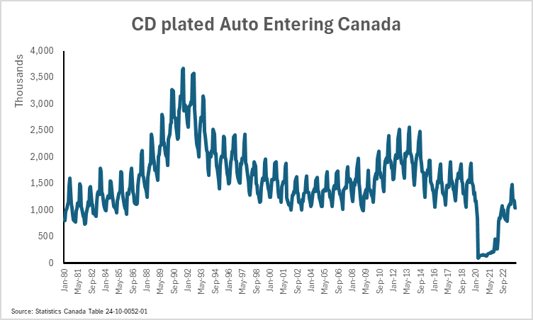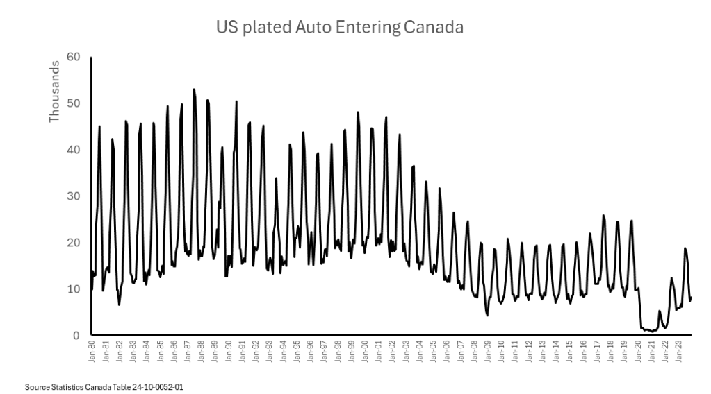 - The Canada-United States Free Trade Agreement in 1988 led to a visible increase of the number of Canadian-plated automobiles crossing the bridge to the US. See Figure 2.