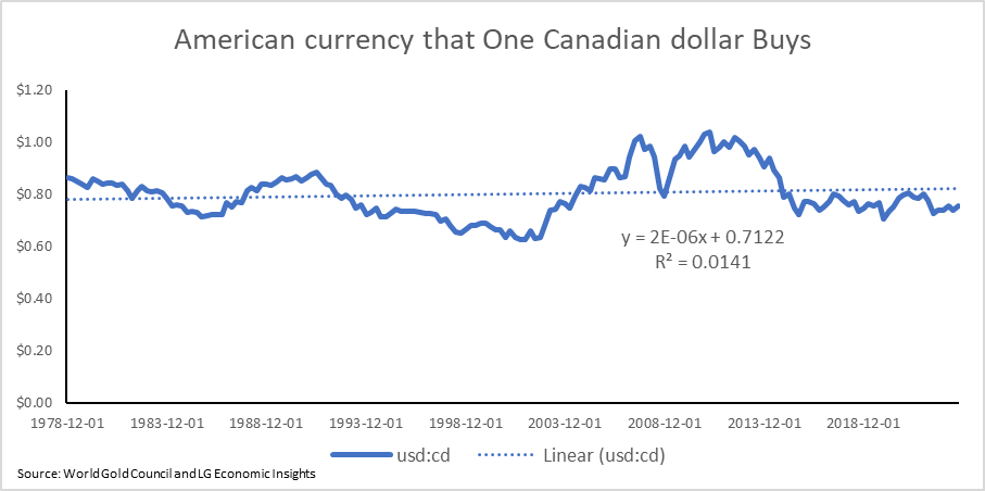- The Canada : United States currency exchange rate. Figure 1 illustrates the Canadian dollars oscillation around its long-term average of US 81 cents. Canadian residents along the border are very knowledgeable about the currency fluctuations as it directly impacts the cost of gasoline (generally cheaper in the US usually because of lower gas taxes), clothing and dairy products to name the most visible. The relative value of the Canadian dollar is shown in Figure 1.