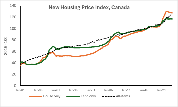 - Price changes of land and new building generally followed each other except for the twenty years 1990-ish through 2005-ish. The supply of land is partly a function of property land-use regulations which may reduce the availability of land for new housing. The cost of the house will reflect the marginal cost of material and labour input.