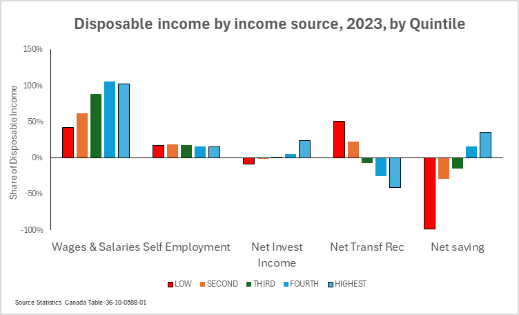 Household disposable income by quintile and source of income for 2023 is illustrated in Figure 1. Not surprisingly four of the five principal sources if income are correlated with income quintile: the share of wages and salaries, net investment income and drawing down on savings rise with income quintile. Self employment income seems independent of income quintile. Not included here is the income by principle source for 1999 but it is broadly similar.