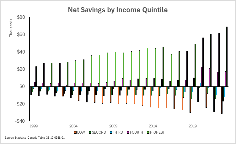 Net saving is the balancing item for funding actual final consumption. Net savings for the two highest quintiles is positive for all years and contributes to increased net worth with the highest net savings captured by the highest quintile. Net savings decline for the other quintiles.