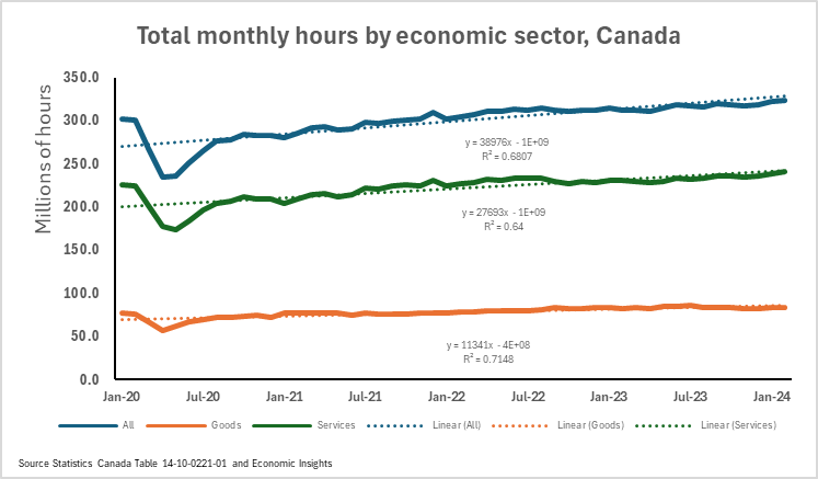 After January 2020 average weekly wages in the service industries shifted higher while average weekly wages in the goods industries continued along their pre-pandemic trend. This suggests that a more detailed presentation focusing on wages for public-facing services may provide some insights for the labour market.