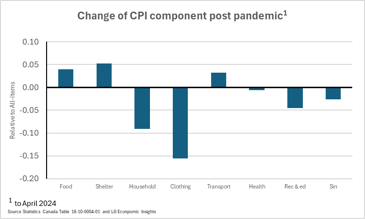 Figure 1 shows the relative price change of each CPI component group from the beginning of the covid-19 pandemic until April 2024 relative to All Items. Three components experienced price increases above All Items, four components had price declines against the average and one, remained essentially unchanged.