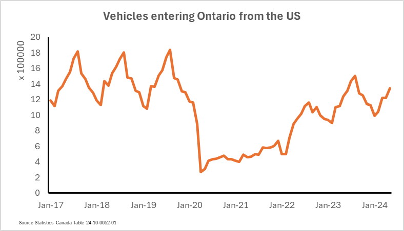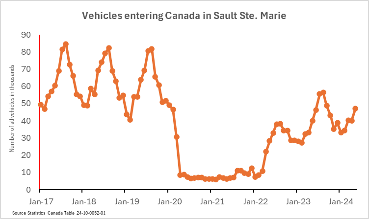 Vehicle entries remain low relative to the long-term entries and, as illustrated in Figure 1, have not recovered from the covid-19 shut down. By early 2024 vehicle entries through Sault Ste. Marie were struggling to return to pre-pandemic levels. And pre-pandemic levels were well down from activity during the turn of the century before the global financial crisis.