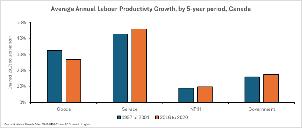 As documented earlier the global socio-economy has experienced historic growth since the first half of the nineteenth century. Higher per capita incomes have enabled improvements of health and education infrastructure contributing to a more than doubling of global expected life times. Higher per capita income is driven by higher productivity. This post complements an earlier post and focuses on labour productivity of four sectors Canadian economy: the goods-producing business sector, the services-producing business sector, non-profit institutions serving households and the government sector. It documents the continuing growth of the economy and hopefully the extension of the golden age well into the future,