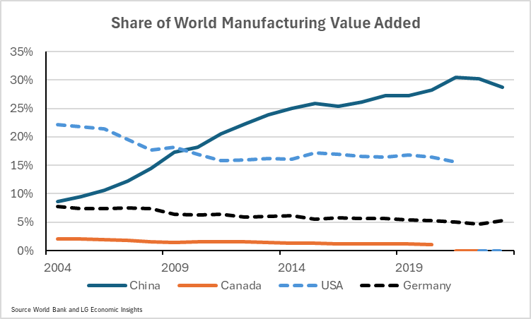 Three of the four sectors generated higher labour productivity the only exception was the goods-producing sector. Key elements of the goods-producing sector has certain challenges. First, global manufacturing was gravitating towards China and Canada’s share was declining because of the rise of China. Even Germany and the United States had declining shares.
