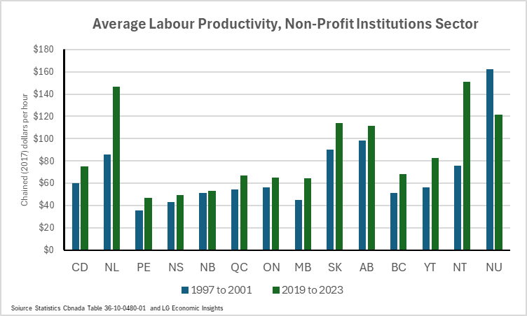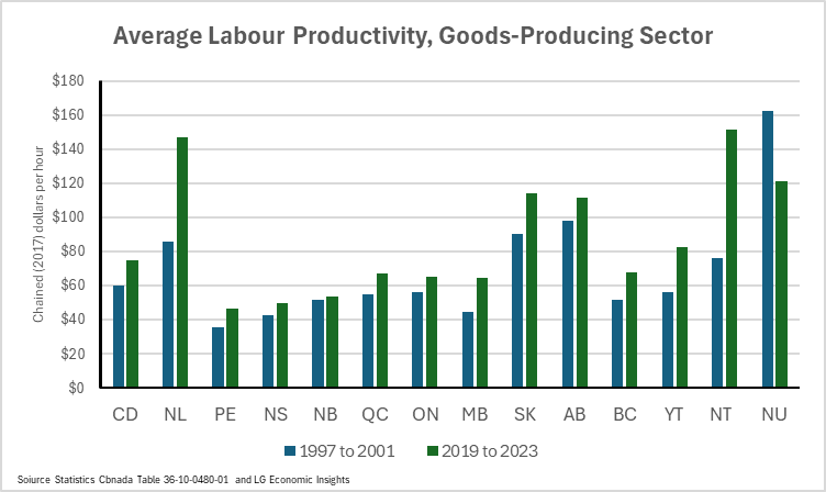 Each of Canada’s 13 economies has a unique mix of sectors. Average annual labour productivity by economic sector for the provinces and territories is illustrated in the next four figures. They will be referenced in future postings but are offered here for review and familiarity.