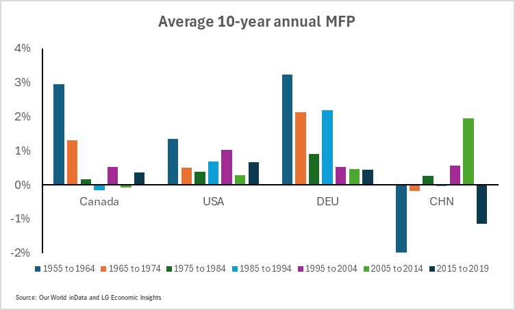 Four countries were selected to illustrate the post War trend of MFP. Canada is the resident country for LG Economics Insights. It is an open, advanced economy emerging out of the war as a major economy but has declined in relative wealth over the last generation. It is now an ordinary advanced economy. The United States was and remains the largest economy in the world. Germany is the largest national economy within the European Union. China is the fast rising next super economy.