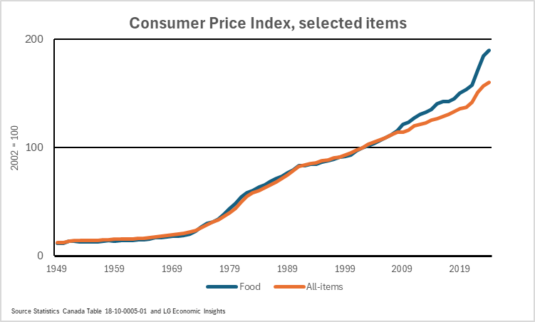 1, Until the global financial crisis Canadian grocery prices rose at a rate slower than inflation as measured by the CPI. This deserves further analysis beyond the scope of this post.