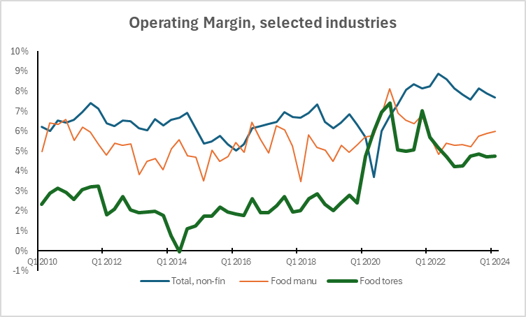 Another candidate for higher grocery prices is profit gouging by industry. The grocery industry’s operating margin, is simply operating revenue minus operating expenditures as a share of operating revenue. This is a proxy for profit margin and is shown in Figure 3.