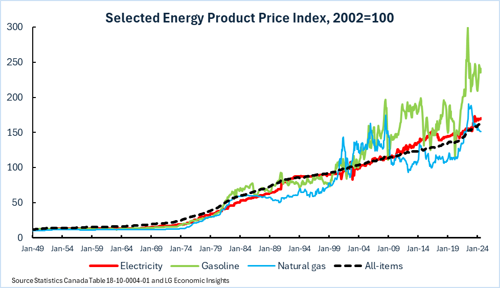 Until the turn of the century the three fuels did not increase in price relative to the general price level, notwithstanding the weakness of natural gas prices after the early 1980s. Energy prices diverged after 2010. Gasoline prices increased dramatically, electricity stayed even with the CPI and natural gas prices continued to be weak. This augers well for the conversion of domestic cars from carbon-based fuels to electricity (EVs). The price incentive to consumers is compatible with environmental policy, but the supporting infrastructure lags.