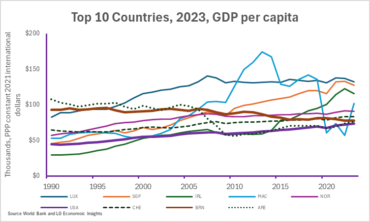The ten highest income countries in 2023 measured by GDP per capita expressed in terms of Purchasing Power Parity (think of The Economist Magazine’s Big Mac Index) were five small Boutique countries producing high valued specialized products including financial and tax avoidance services and three niche economies reliant on the production of a narrow range high valued products including petrochemicals. The United States was the only country in the top ten with a large diversified economy. See Figure 1.