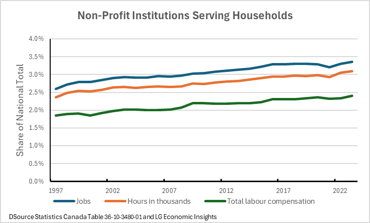 NPISH is the smallest of the six economic sectors of the Canadian economy. It is an indicator of the vitality of civil society. accounting for approximately three per cent of the quantity of labour employment at less than eighty percent of the average wage.
