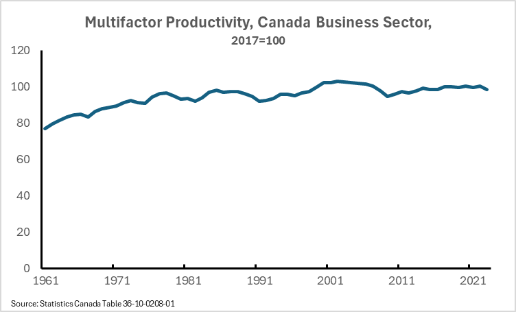 A measure of innovation is Total Factor Productivity, the share of increased productivity above the simple increase of labour and capital. In Canada, Statistics Canada measures and publishes multifactor productivity. Canadian multifactor productivity follows a similar pattern as US Total Factor Productivity.